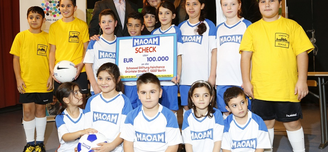 Neben Joachim Löw nahm auch der Leiter der HARIBO-Unternehmenskommunikation, Marco Alfter, die Vorsitzende der Stiftung Fairchance, Dr. Verena Schöwel, MAOAM-Jungwerbestar "Jogi" und zahlreiche Kinder der Berliner Vineta-Grundschule an der Übergabe teil. MAOAM liegt die Förderung von jungen Menschen am Herzen, deshalb unterstützt die Marke gerne erfolgreiche Bildungsprojekte.